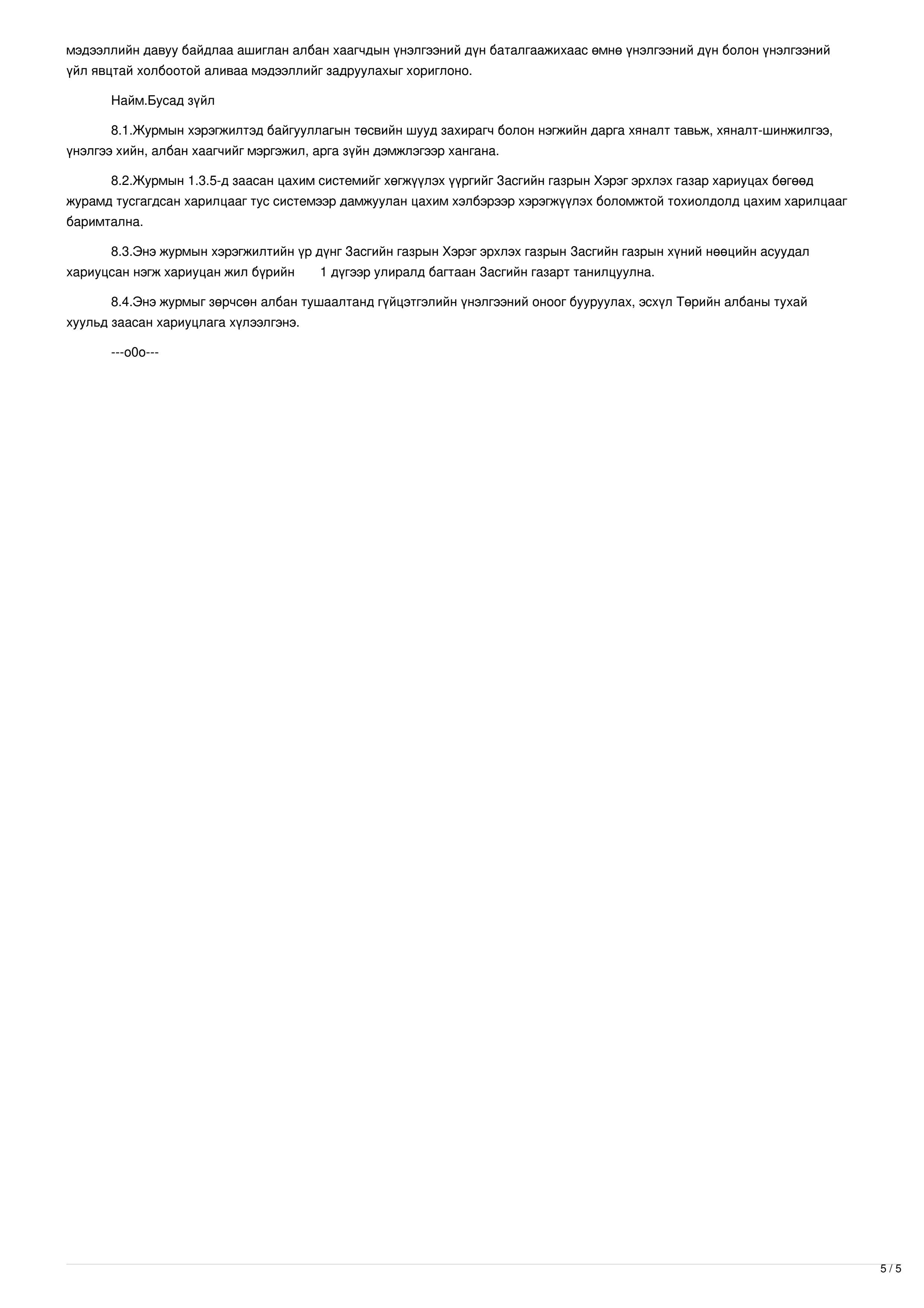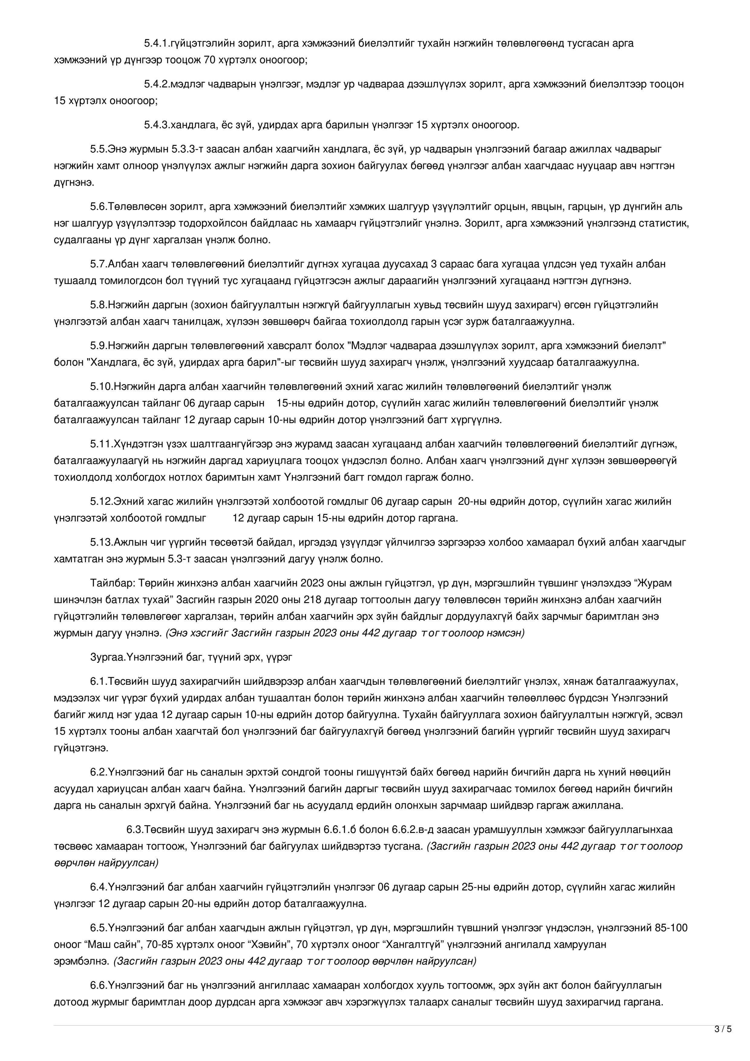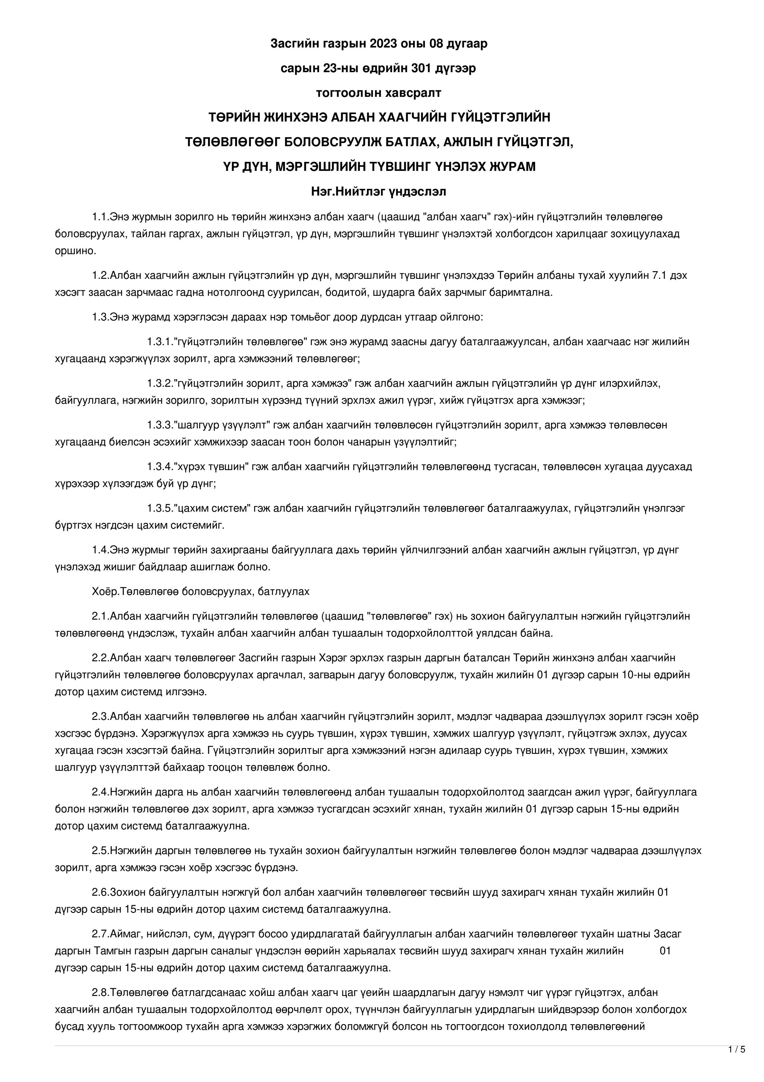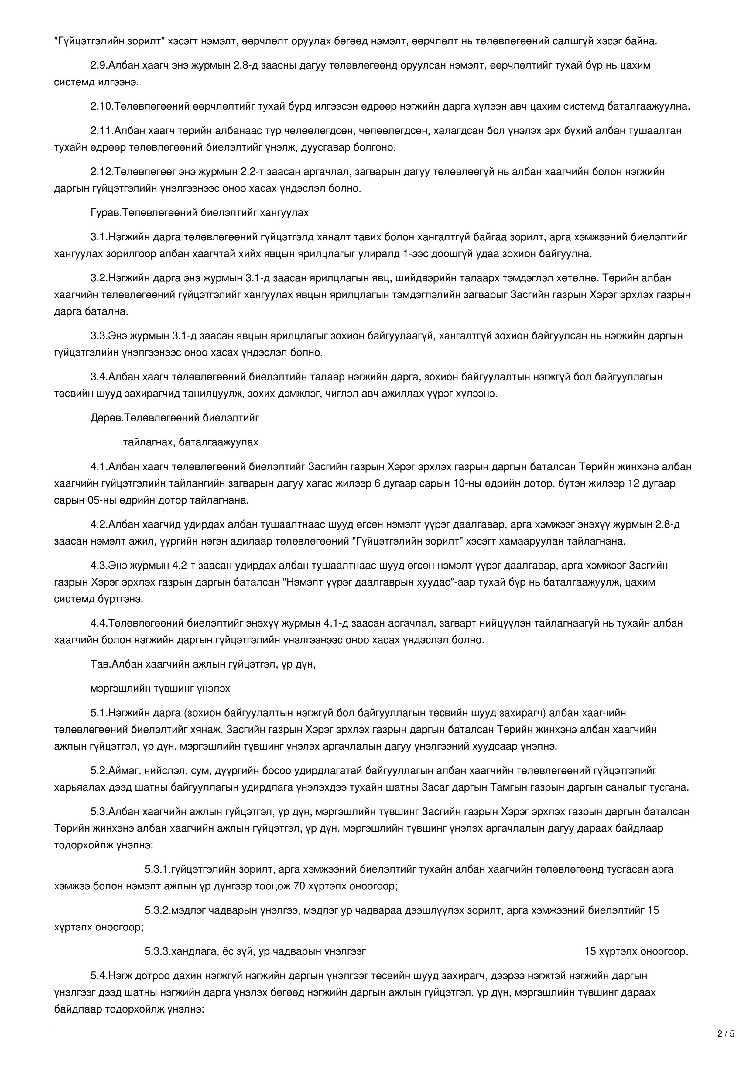 ТӨРИЙН ЖИНХЭНЭ АЛБАН ХААГЧИЙН ГҮЙЦЭТГЭЛИЙН ТӨЛӨВЛӨГӨӨГ БОЛОВСРУУЛЖ БАТЛАХ, АЖЛЫН ГҮЙЦЭТГЭЛ, ҮР ДҮН, МЭРГЭШЛИЙН ТҮВШИНГ ҮНЭЛЭХ ЖУРАМ